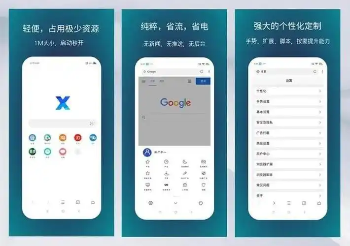 描述: X浏览器是一款功能强大的手机浏览器,支持浏览器扩展、JS脚本、资源嗅探、操控手势及广告拦截等多项高级功能。它以其极小的体积实现了高效、流畅的浏览体验,同时注重用户隐私保护,无新闻推送、无后台服务,自动拦截垃圾广告。X浏览器还支持个性化设置,如主题更换、菜单布局调整等,满足用户的不同需求。