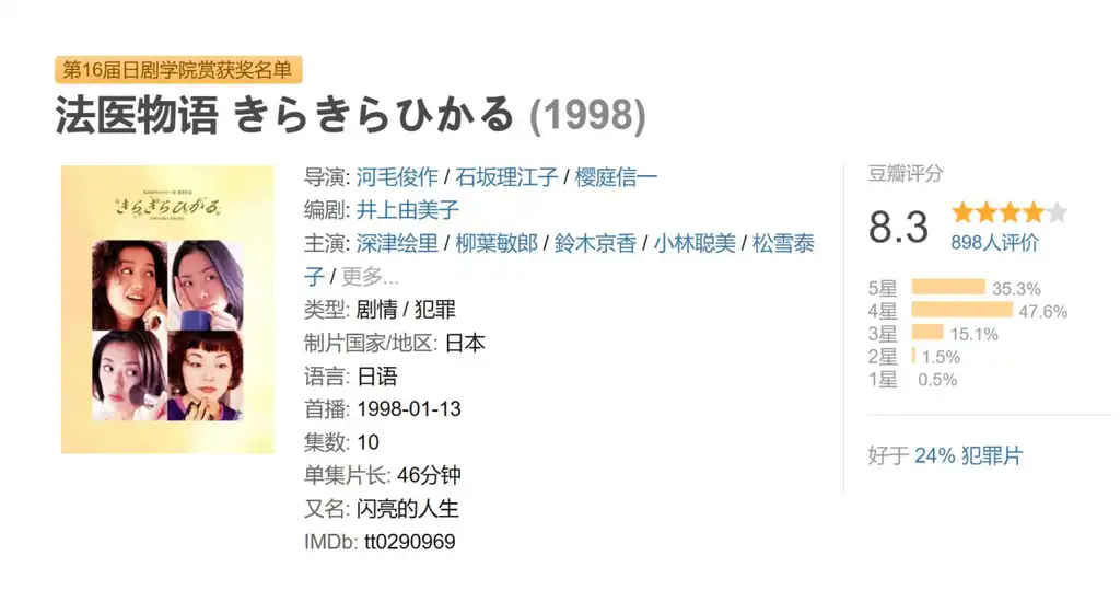 日文的片名《きらきらひかる》,直译是「閃亮的光」,意指本劇主角新進法醫天野光。天野光(深津绘里)由于一次偶然的机会看到案发现场,对当时出现现场的法医杉裕里子(铃本京香)非常崇拜,因此放弃了上医学系的机会而学习法医。毕业了刚开始从事法医行业的她面对一件件案子,一具具尸体,尽力寻找着事实的真相。认识了自己崇拜的里子和同事荣子(小林聪美)、早稻田毕业的高级刑警纪子(松雪泰子),成为好友常在一起吃饭聊工作和生活。
