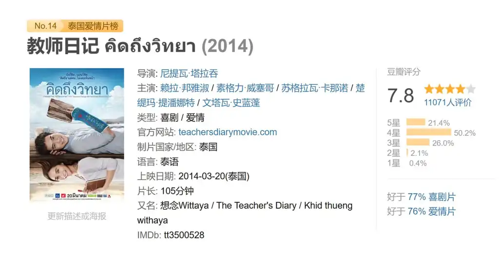 描述: 宋(素格力·威塞哥 Sukrit Wisetkaew 饰)曾经是一名拳手,如今却成为了偏远坝区小学的教师。学校里的条件异常艰苦,没水没电没信号,宋感到自己简直就像生活在孤岛上一样,十分孤独。一次偶然中,宋得到了一本日记,日记的主人是曾经在这里教过书的安(赖拉·邦雅淑 Laila Boonyasak 饰),安在日记里详细记录了她在这里的教书生涯,随着时间的推移,宋想要见到安的念头渐渐强烈起来。