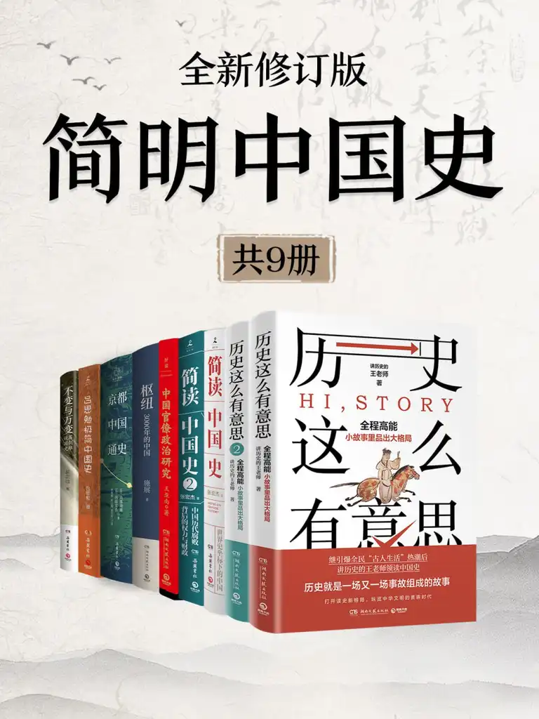 描述: 涵盖中国历史的方方面面,由史学家张宏杰、吕思勉、葛剑雄、讲历史的王老师、胡阿祥等人著。《历史这么有意思1+2》《简读中国史》《吕思勉极简中国史》等。