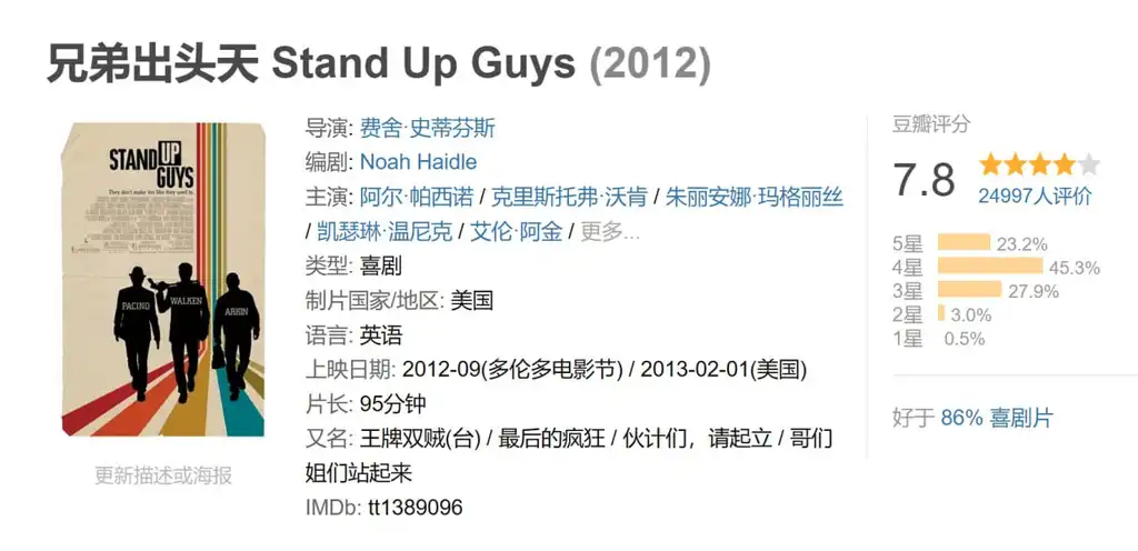 描述: 在经历了28年的牢狱之灾后,沃尔(阿尔·帕西诺 Al Pacino 饰)终于重新回到了自由的怀抱,久违的老友道克(克里斯托弗·沃肯 Christopher Walken 饰)前来迎接,两人都无法抑制各自内心的激动和喜悦。尽管在沃尔服刑期间,世界发生了翻天覆地的变化,但和老朋友之间的友情依然坚定而持久。之后,老友赫希(艾伦·阿金 Alan Arkin 饰)也加入了沃尔和道克的狂欢之中,他们一边回忆着旧日往事,一边尽情享受着自由带来的快乐和放纵。