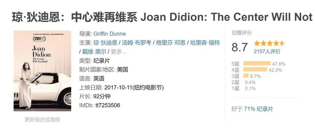 描述: 格里芬·邓恩历时多年拍摄的纪录片肖像,展现了她那异常清晰的文字精神:影片既扩展又聚焦,优雅坦率地展现了动荡的文化历史,并扎根于迪迪恩本人那富有启发性的存在感和言语。这无疑是一部关于失落的电影——失去坚实的美国中心,失去丈夫和孩子的个人损失——但迪迪恩用极其细致、完整且勇敢的方式描写她所见所经历的一切,将生活中最糟糕的时刻转化为理解的契机。
