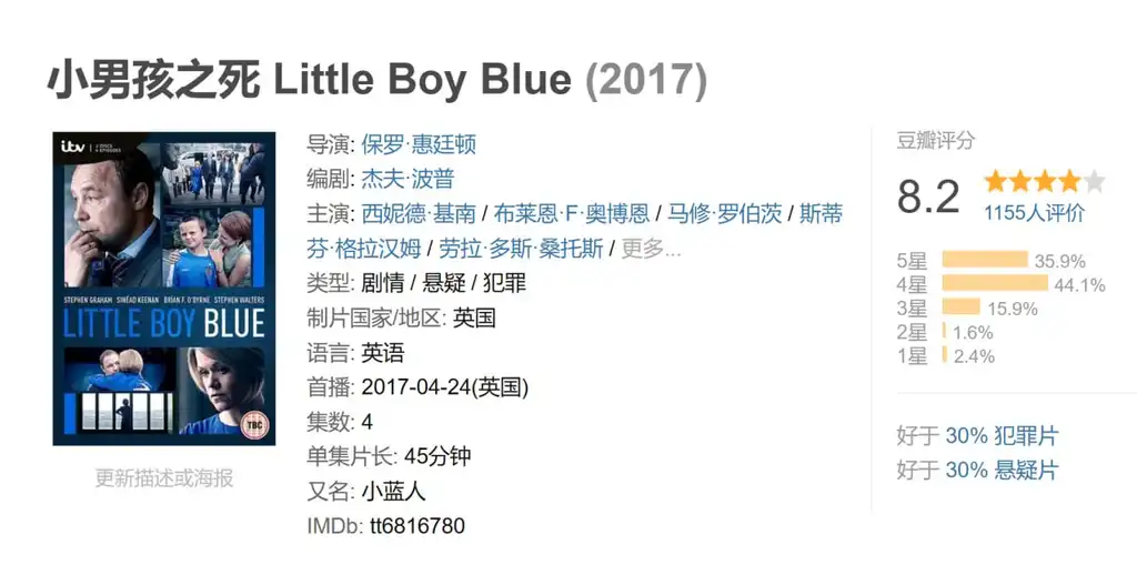 小男孩之死 Little Boy Blue (2 2025年12月11日 09:44 夸克网盘 剧情 悬疑 犯罪 小男孩之死 描述: 本剧由真实故事改编,讲述2007年在利物浦的克罗克斯泰思,一名十一岁的男孩里斯·琼斯惨遭枪杀,他的父母梅勒妮和史蒂夫备受折磨。而杀害里斯的凶手和同谋最终被绳之以法。 📁 大小: A 链接: 夸克网盘