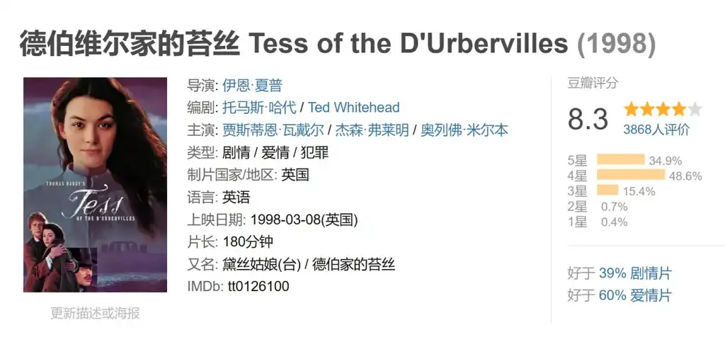 描述: 根据哈代同名小说《苔丝》改编而成。