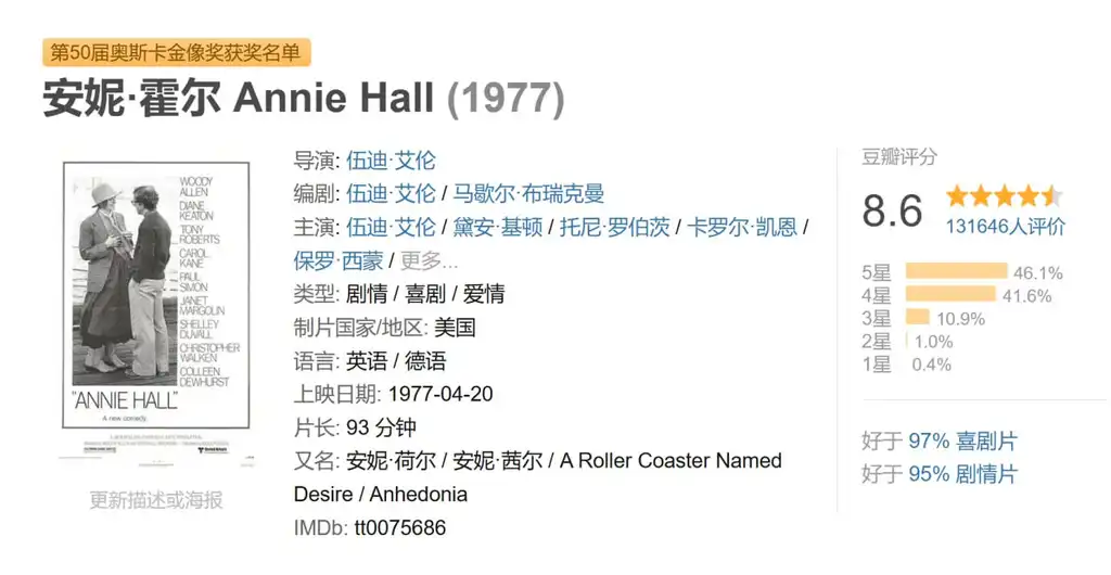 描述: 喜剧演员艾维·辛格(伍迪·艾伦 Woody Allen 饰)是这样一个人:非常介意自己的犹太人的出身;自认为有童年阴影,看了十六年心理医生没见好转却一直付钱看;有点阿Q精神,但对人生却充满消极;喜欢一直讲无聊的笑话。正因为自身的神经质特质,艾维经历了两次失败的婚姻。
