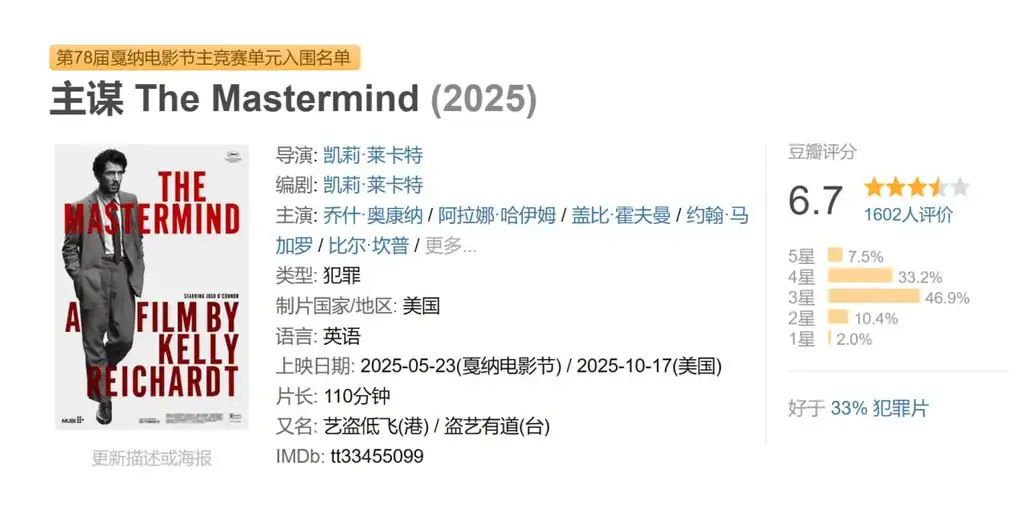 描述: 在天眼尚未密布,监场保安仍会打瞌睡的二十世纪七十年代,名画大盗就是会光天化日,大剌剌走进美术馆,直接把猎物从墙上取下放入布袋运走。看似儿戏的一切,背后主谋还要是住在市郊、人畜无害的住家男人。凯莉·莱卡特完全弃用好莱坞盗宝片叙事公式,改以其擅长的左翼简约主义镜头,捕捉触犯艺术罪行者的日常生活、双面人的言行处境,以及事件周遭人情冷暖。阿瑟多夫的抽象画作未必是一个借口,但到头来凸显存在荒谬的公路逃亡,俨然为观众添加了不少欣赏和思考的层次。