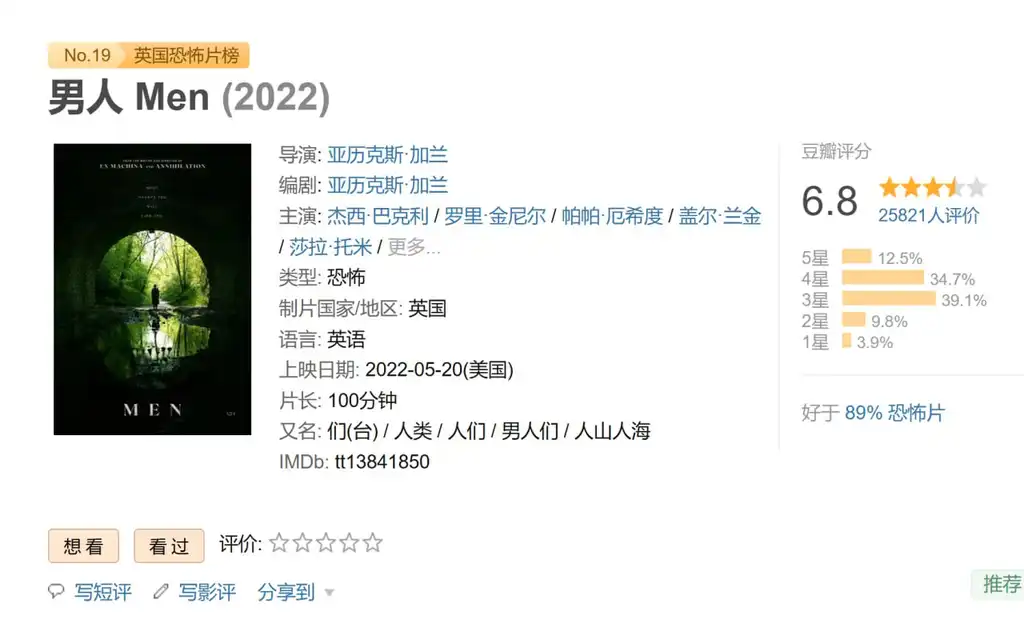 描述: 哈珀(杰西·巴克利 Jessie Buckley 饰)刚刚结束了自己的婚姻,这场婚姻对于她来说简直就是一场噩梦。哈珀的丈夫詹姆斯(帕帕·厄希度 Paapa Essiedu 饰)是一个非常神经质,且占有欲很强的男人,在无数次激烈的争吵之后,哈珀终于决定离开他。可是,就在这个节骨眼上,詹姆斯在哈珀的眼前坠楼死亡了。