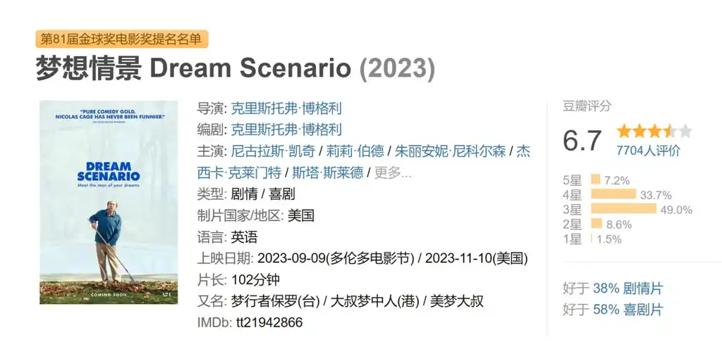 描述: Nicolas Cage饰演Paul Matthews,一个拥有终身教授头衔的平平无奇家庭男子,热爱进化生物学以及对自己的一事无成感到焦虑。有一天,他发现自己出现在别人的梦中。和生活中一样,他在这些梦中的存在是平庸和非侵入性的——他只是在那里,冷漠地盯着陌生人的幻想和噩梦。尽管如此,他一夜之间成为了一名名人,享受着爆火的洗礼。但是,保罗逐渐发现这是一个潘多拉的盒子,梦中的自己开始莫名思妙地变得暴力……