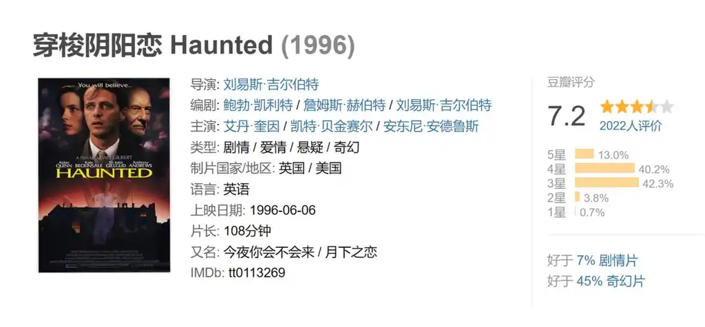 描述: 大卫(艾丹·奎因 Aidan Quinn 饰)是就职于耶鲁耶稣学院的灵学教授,某日,他收到艾德布鲁克家三兄妹的邀请,前往宅邸调查发生在那里的灵异事件。罗伯特(安东尼·安德鲁斯 Anthony Andrews 饰)带人冷淡而疏离,西蒙(Alex Lowe 饰)则恰恰相反,是个热情活泼的年轻人,最让大卫在意的,是最小的妹妹克里斯汀娜(凯特·贝金赛尔 Kate Beckinsale 饰),她的自信和独立深深的吸引着大卫。