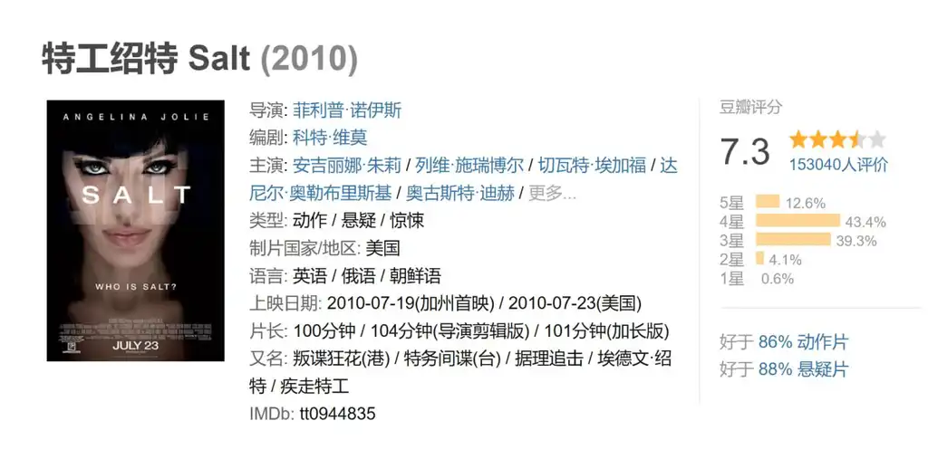 描述: 结婚纪念日当天,CIA特工伊芙琳·绍特(安吉丽娜·朱莉 Angelina Jolie 饰)受命审讯一名投案自首的俄罗斯间谍。对方声称自80年代便潜入美国,并且透露有一名间谍大师曾训练数名儿童,将他们培养成间谍送入普通的美国家庭中,伺机刺杀美国总统。令在场所有特工震惊的是,这个俄国人竟指认绍特是这群孩子中的一员。