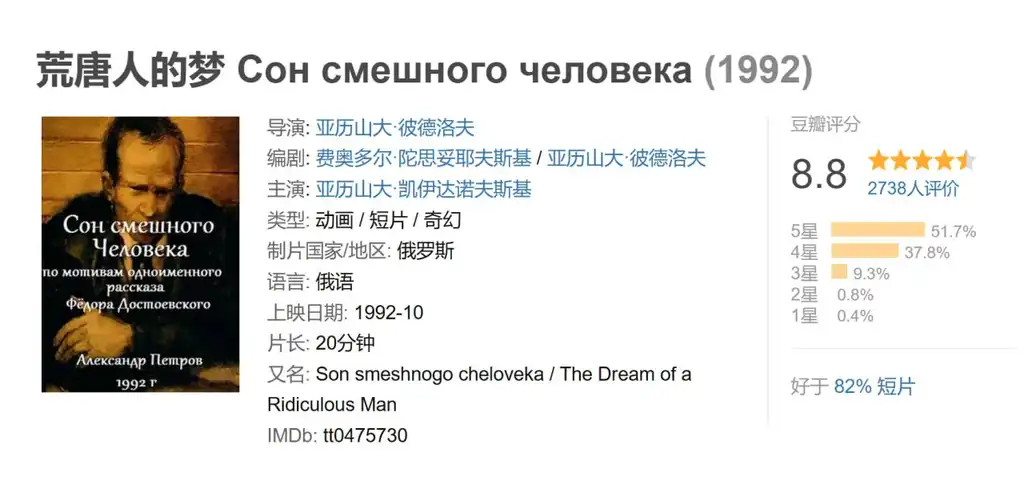 描述: 作品据陀思妥耶夫斯基《荒唐人的梦》改编,描述一个对生活绝望而准备自杀的男子,因为与一个小女孩的意外邂逅,而重获新生。