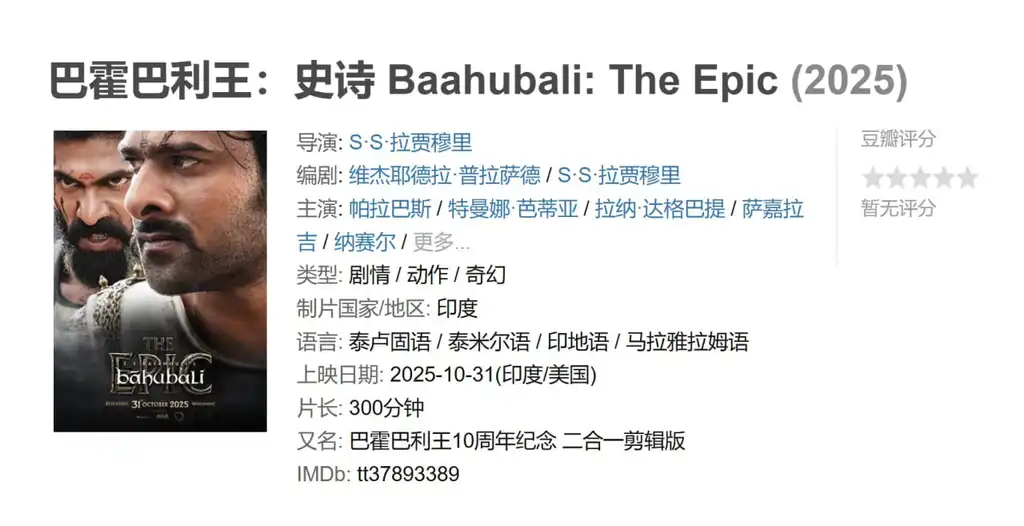 描述: 著名印度导演SS·拉贾穆利宣布将在十周年(周四)上映《巴霍巴利王:史诗》这部雄心勃勃的两部分重剪版本。根据拉贾穆里在X上的帖子,《巴霍巴利:史诗》是《巴霍巴利:起源》(2015)和《巴霍巴利2:结局》(2017)的结合体。