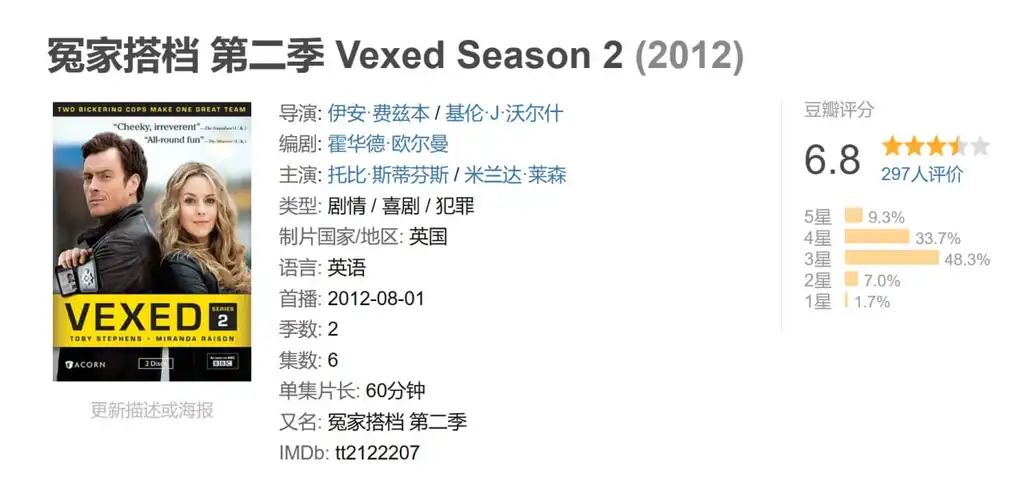 描述: BBC 第二台宣布侦探喜剧《烦恼》第二季的拍摄已经开始,该剧由托比·斯蒂芬斯(《简·爱》、《罗宾汉》、《剑桥间谍》)主演,他再次饰演 DI 杰克·阿姆斯特朗,与米兰达·雷森(《幽灵》、《梅林》、《已婚单身者》)搭档,后者饰演新晋升的 DI 乔治娜·迪克森。