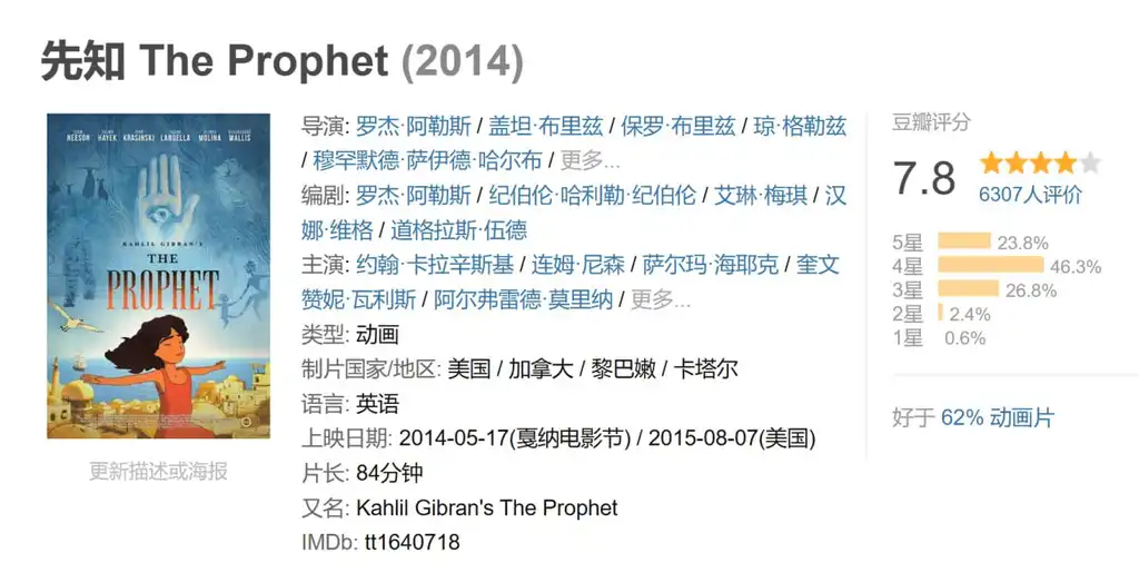 描述: 这部动画片根据卡里·纪伯伦的同名作品改编,每一部分由不同导演执导,其中包括《狮子王》导演罗杰·阿勒斯和《海洋之歌》导演汤姆·摩尔,声优云集连姆·尼森、塞尔玛·海耶克、奎文赞妮·瓦利斯等。