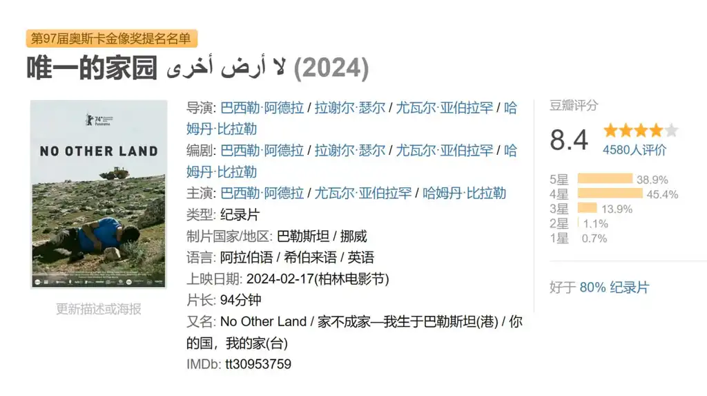 唯一的家园 لا أرض أخرى (2024) 2026年02月03日 14:36 夸克网盘 纪录片 唯一的家园 描述: 这部由巴勒斯坦人和以色列人共同制作的影片展现了以色列当局对约旦河西岸马萨费尔亚塔的破坏,以及巴勒斯坦活动家Basel和以色列记者Yuval之间的友谊。 📁 大小: A 链接: 夸克网盘