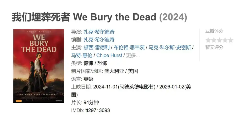 我们埋葬死者 We Bury the Dead 2026年02月05日 14:27 夸克网盘 惊悚 恐怖 我们埋葬死者 描述: 艾娃(黛西·雷德利 饰)是一名绝望的妇女,她的丈夫在一次灾难性军事实验后失踪,她加入了一个“尸体搜寻小组”,但当她埋葬的尸体开始出现生命迹象时,她的搜寻工作发生了令人毛骨悚然的转变。 📁 大小: A 链接: 夸克网盘