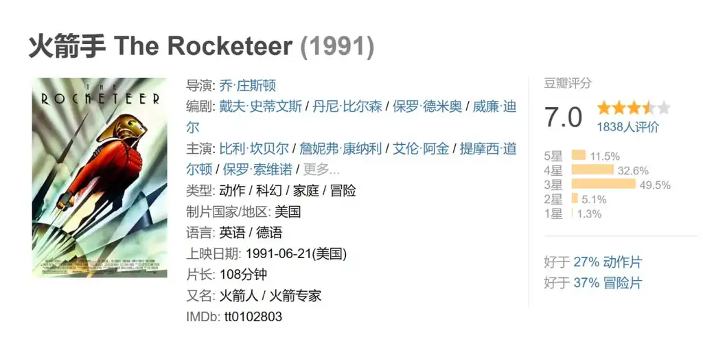 描述: 本片是发生在1930年代的好莱坞,有一个军方的秘密武器意外落在一位竞技表演飞行员Cliff Secord手中,他对此一推进器颇感惊奇, 最后他背上了这付怪东西、戴上面具,成了行侠仗义的『火箭人』,然而各方人马都想夺得这项秘密武器,尤其有一位好莱坞影坛的知名男演员 Neville Sinclair ,他其实是纳粹潜伏在好莱坞的情报份子,为了夺得火箭,他还挟持了Cliff的女友Jenny Blake,火箭人Cliff于是展开他的救援行动。