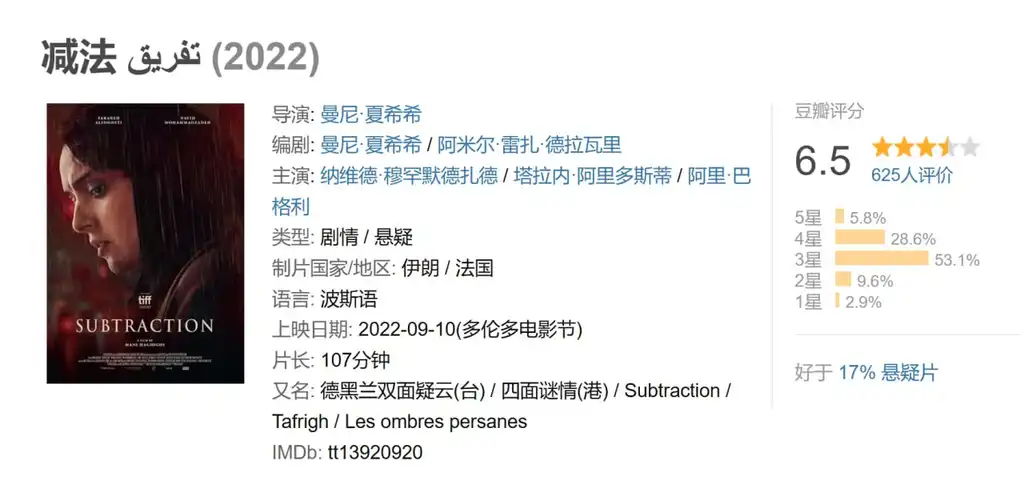 描述: 受产前抑郁困扰的法莎娜从雾雨车窗外望,瞥见丈夫贾拉身影进入高级公寓,怀疑他有外遇,贾拉却言之凿凿当天不在德黑兰。查探之下,竟发现另一对夫妇,相貌与他们雷同,俨如是彼此分身。对镜互照,看出自己的不足,也看出伴侣的缺陷,单纯的偶遇演变成纠结四角关系。掩映在暗黑光影下是希区柯克式悬疑惊栗,渗透于滂沱大雨中却是曼尼·夏希希对伊朗式婚姻、道德以至人性矛盾的深沉体悟;在神权政体下,人必须自我分裂甚至自我毁灭,方能让“我”活下去?
