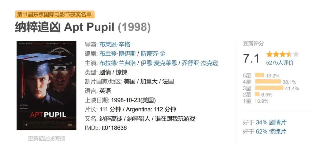 描述: 托特(布拉德·兰弗洛 Brad Renfro 饰)是一个十六岁的青年,和所有这个年纪的男孩一样,他活泼开朗,对世间万物充满了好奇,但有一股与生俱来的另类力量隐藏在他的灵魂之中。一次偶然中,托特发现了一个惊人的秘密,自己所居住的平静小镇上,居然住了一个曾经在二战时期犯下过累累罪行的前纳粹军官科特(伊恩·麦克莱恩 Ian McKellen 饰)。