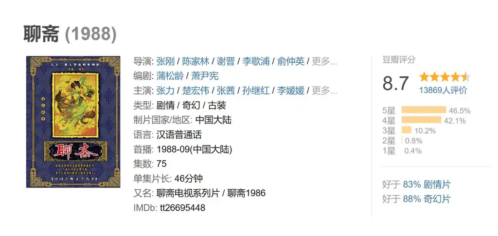 描述: 山野荒郊,月隐星稀。一宅昏黄的灯笼自远而今,冷寂的青灯下,几多诡异离奇的故事悄然上演。乐善好施的美丽狐女辛十四娘、笑声朗朗令人一见忘忧的婴宁、为求得美人阿宝而砍断六指的书生孙子楚、因无心的邀请而和狰狞的陆判交上朋友更换了心肝的朱儿旦、知恩图报挥金如土的神异八大王、偷吃他人的鸭子浑身长满鸭毛的懒汉、喜好杯中之物而和水鬼交上朋友的渔夫。一段段传奇故事相继上演,妖魔鬼怪、狐仙精灵,分不清说的究竟是人是怪。个中深意,只留待看官品咂玩味……
