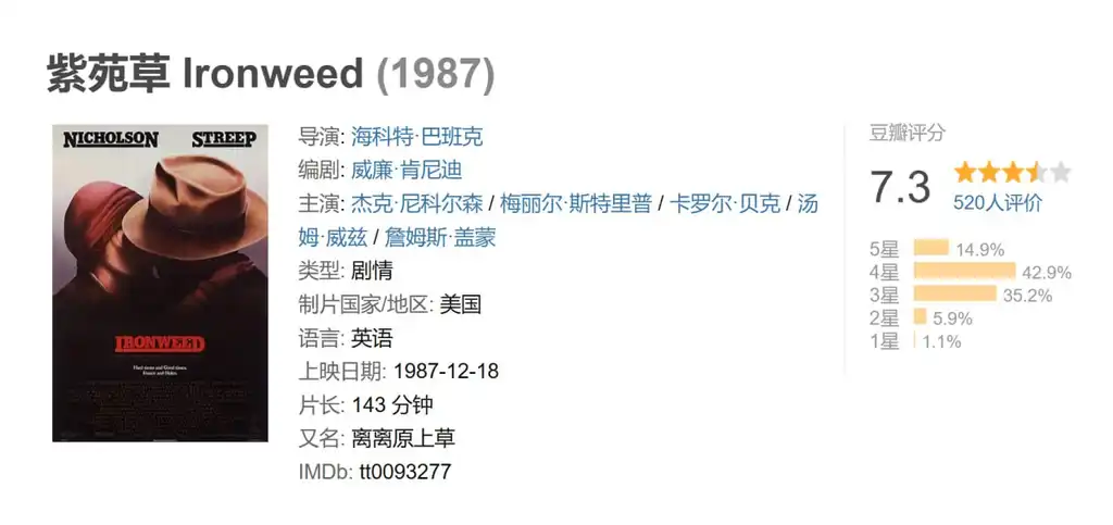 描述: 故事发生在1938年的万圣节前夕,弗朗西斯(杰克·尼科尔森 Jack Nicholson 饰)曾经是在圈内叱咤风云的棒球运动员,却因为一场意外一蹶不振,只能依靠酒精麻痹自己,最终沦落成为了酒精依赖症患者。