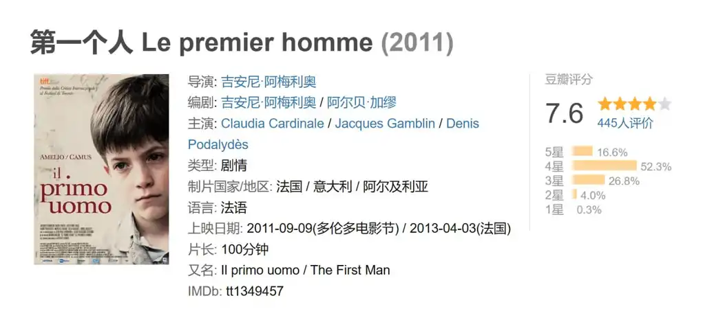 描述: 电影改编自加缪未完稿的自传小说《第一个人》,意大利名导吉亚尼·阿梅里奥(Gianni Amelio)在影片中为原著的空白处补上漂亮的几笔。