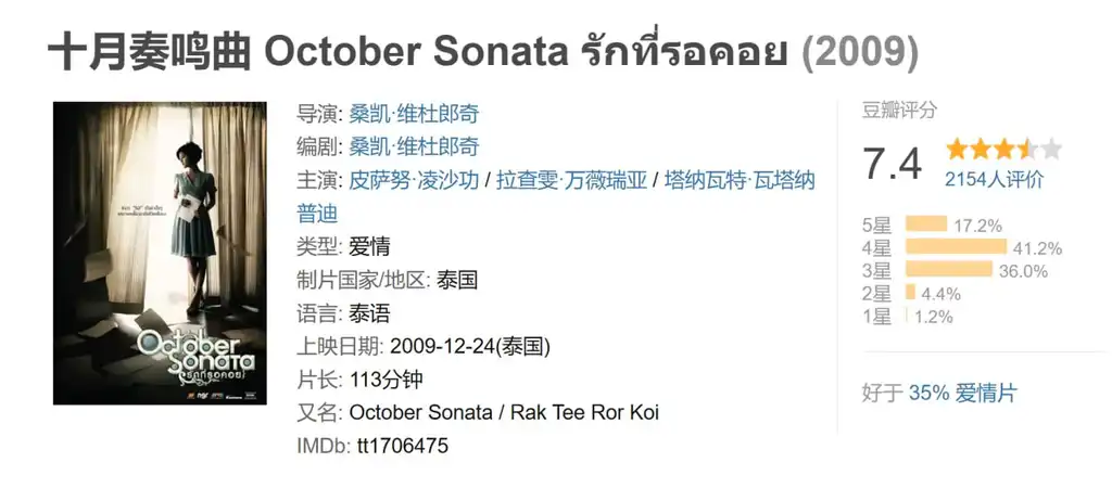描述: 在偶像逝世的夜晚,伤心过度的幸珍(Ratchawin Wongviriy 饰)遇到了一个叫拉维(Thanawat Wattanapoom饰)的男子,两人互生情愫。第二天,拉维就要出国留学两年,他送给幸珍一本小说,并约定两年后的10月8日在珠光旅馆相见。在两年的等待中, 不识字的幸珍读了夜校,认识了从中国移民来的林(Pitsanu Nimsakul饰)。林非常喜欢她,不仅介绍她去拜师学艺,还无微不至地关心她。可是幸珍一心等待拉维,两年的期限一到,她就迫不及待前去赴约,可是却失望而归。一年又一年,每到10月8日这一天,幸珍都会如约而至……拉维和幸珍的恋爱就如同一场太阳与月亮的浪漫爱情,虽然时光短暂,但却彼此影响一生。