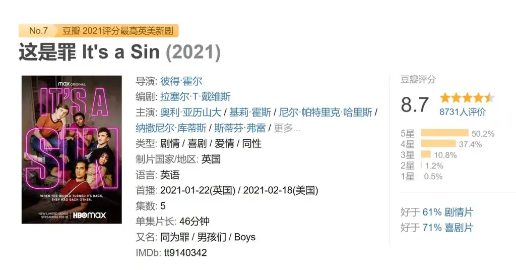描述: Channel 4的5集剧《这是罪》讲述80年代时三个男孩Ritchie(Olly Alexander饰)﹑Roscoe及Colin的故事,剧情长度将横跨10年。三名主角在18岁时离开家乡,带着希望﹑野心来到伦敦。然而当他们感染上爱滋病后(当年有发生血液污 染案,造成大量人感染肝炎及爱滋病),这在当时仍然充斥着各种谣言的病使他们在别人眼中是威胁﹑恐怖的存在,不过主角们也因此团结起来。