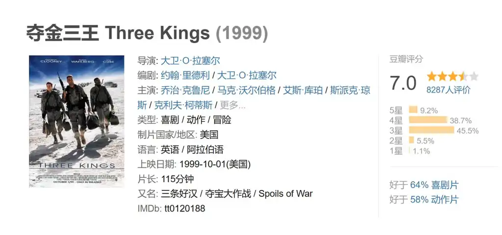 描述: 海湾战争终于结束了。三个好兄弟阿奇(乔治·克鲁尼 George Clooney 饰)、特洛伊(马克·沃尔伯格 Mark Wahlberg 饰)和埃尔金(艾斯·库珀 Ice Cube 饰)准备在退役前结结实实捞上一笔,那样他们退役后就能舒舒服服地享受人生了。可不要以为他们 在异想天开,其实他们早就在伊拉克听到坊间传闻:总统萨达姆暗中收藏了一批从科威特偷来的黄金在他的秘密碉堡内。恰巧兄弟三人从伊拉克的一名战俘的屁眼处发现了一张萨达姆秘密碉堡的地图,于是三人经过准备,往夺宝之路进发……