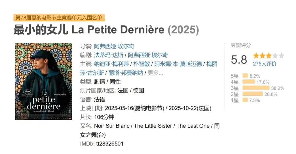 描述: 出身穆斯林家庭的少女法蒂玛,即将前往巴黎读大学。站在人生岔路口,她面临性向与信仰的缠斗。对女体难以启齿的贪恋,化为交友软件上无数个假名与忘我缠绵的幽会。随着晨祷掺入杂念,法蒂玛遇见命定的那个她,在亲密关系里感受爱与伤,却依旧迷茫。四季递嬗间,那些扪心自问的日与夜,会将法蒂玛带往何方?