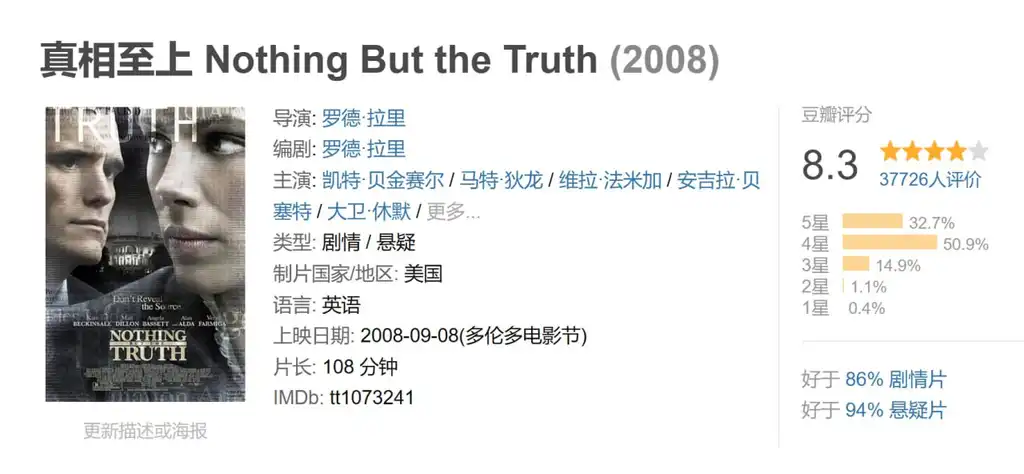 描述: 女记者瑞秋(凯特·贝金赛尔 Kate Beckinsale 饰)从线人处获得了一份情报涉及政府一次相当不光彩的行为。在丈夫雷(大卫·休默 David Schwimmer 饰)支持下刊登了这起新闻报道。政府最终以泄露国家 机密的罪行将瑞秋推上被告席,主审该案件的则是自负的检察官帕顿(马特·狄龙 Matt Dillon 饰)。在法庭上,面对帕顿的层层逼问,瑞秋坦然地叙述了整个事件的前前后后,公众心中的天平也开始往瑞秋方面倾斜,但是艾伦坚持要求瑞秋必须说出资料的提供者是谁,瑞秋逐渐地陷入进退两难的境地。艾伦开始向舆论和瑞秋的家人施加压力,而雷也渐渐地抵抗不住国家给予的压力,建议瑞秋屈服于国家。但瑞秋向雷表达了自己的坚持:真相至上。
