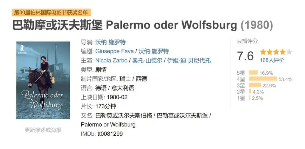 描述: 影片从巴勒莫镇开始,影片的主角尼古拉是西西里高失业率的年轻受害者。他决定离开巴勒莫前往德国沃尔夫斯堡寻找工作。与法斯宾德的《Angst essen Seele auf》(1973年)一起,施罗特的这部电影成为少数探讨外国人在失去本国家庭和社区结构支持的情况下,努力融入德国社会所面临困难的影片之一。像《那不勒斯王国》一样,《巴勒莫或沃尔夫斯堡》遵循时间顺序结构,但施罗特在这部电影中的创新在于将叙事分为三个截然不同的部分或幕,每个部分都有其独特的风格。《巴勒莫或沃尔夫斯堡》于1980年在柏林电影节获得享有盛誉的金熊奖,这也是首个授予德国导演金熊奖的纪录。