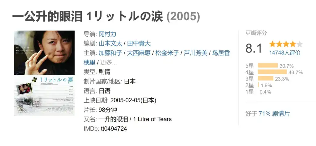 描述: 本片改编自日本同名文学作品《一升的眼泪》,作者是一位坚强的罕见疾病患者。1986年首次出版创下26万本的销售纪录。