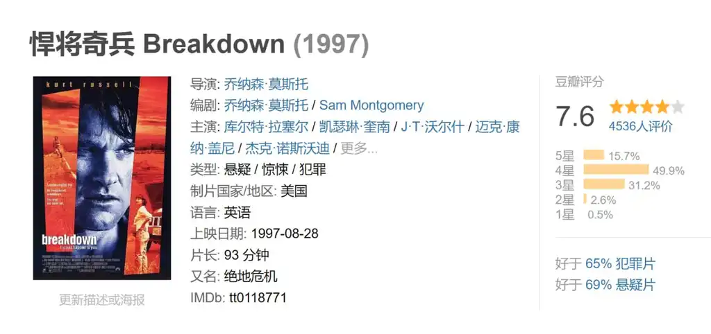 描述: 杰夫(库尔特·拉塞尔 Kurt Russell 饰)和艾米(凯瑟琳·奎南 Kathleen Quinlan 饰)是一对夫妻,在一次长途旅行之中,两人驾驶的车辆在荒郊野岭里抛锚了。正当两人急得焦头烂额之际,一个名叫瑞德(J·T·沃尔什 J.T. Walsh 饰)的陌生男人出现在了他们面前。瑞德好心的告诉杰夫和艾米,在不远处有地方能够叫到拖车,杰夫边让艾米跟随瑞德前往,很快,这个错误的决定就让杰夫付出了代价。