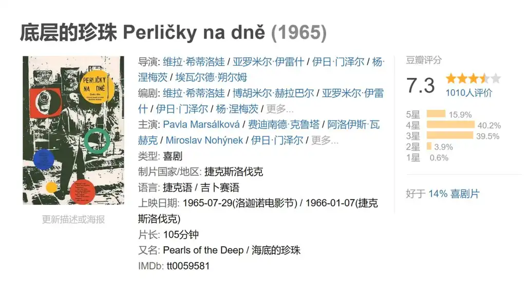 描述: 本片是捷克新浪潮运动兴起时的一次集体亮相,这些崇尚个性的导演大多数毕业于布拉格电影学校,他们希望打破苏联电影教学模式试图以崭新的影像语言描绘他们所看到的世界,这些题材各异的短片表现了年轻导演对于世界的理解和他们的关注点,这五位导演分别是伊日· 门泽尔(《严密监控的列车》)、维拉 齐蒂洛娃(《雏菊》)、亚罗米尔·伊雷什(《瓦莱莉和她的奇迹一周》)、埃德尔瓦·朔尔姆和扬·涅麦茨。他们以他们的年轻和热情在一个禁忌的年代用最大可能表现了他们的思想和充满先锋、前卫的视觉。