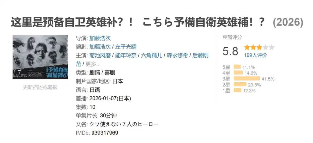 描述: 拥有各式奇怪能力、在人生低谷挣扎的自由业者流伟月(菊池风磨 饰),与另外六名同样处境糟糕的青年,被防卫省秘密召集。原以为只是例行通知,他们却突然被告知将承担“特殊任务”,以自身的怪癖与能力组成前所未有的英雄小队。七人各有缺点与自卑,却在混乱的训练与任务中逐渐发现自己的价值,展开一场用“另类能力”拯救世界的荒诞而热血的英雄之旅。