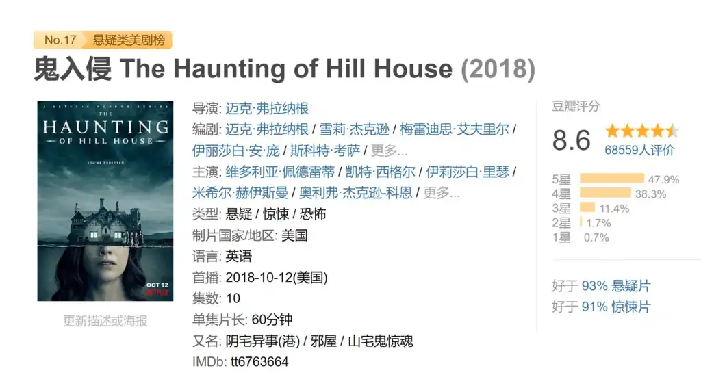 描述: 《鬼入侵》是雪莉·杰克逊同名经典小说的现代改编版,讲述了在美国最有名的鬼屋中长大的五个兄弟姐妹的故事。成年后,他们因为最小的妹妹的自杀而重新聚到一起,迫使他们最终面对与自身过往有关的鬼魂,一些潜伏在他们的心中,还有一些潜伏在这幢著名的山之屋(Hill House)的阴暗处。