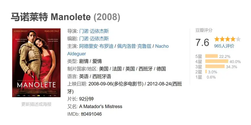 描述: 本片中布罗迪将扮演具有传奇色彩的西班牙斗牛士曼纽尔·罗德里格斯·桑切斯;而克鲁兹则饰演他的爱人——女演员卢普·斯诺。