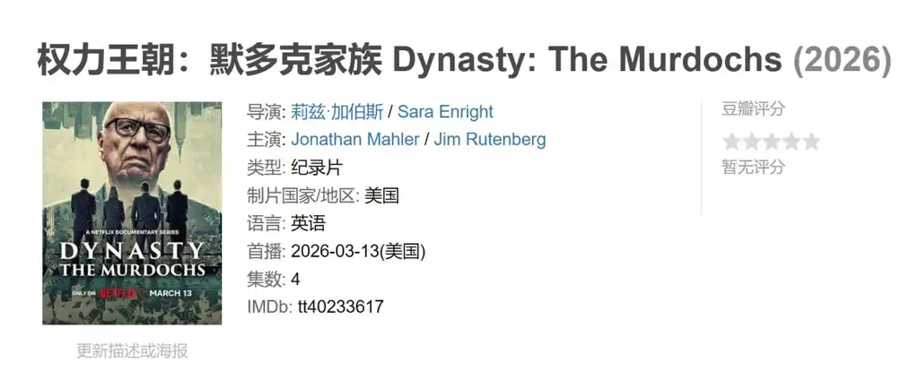 权力王朝:默多克家族 Dynasty: The 2026年03月13日 20:50 夸克网盘 纪录片 权力王朝 默多克家族 描述: 在这部引人入胜的纪录片系列中,默多克的子女为了争夺他庞大的媒体帝国,展开激烈的继承权之战 📁 大小: A 链接: 夸克网盘