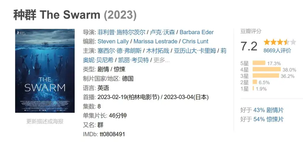 描述: 《The Swarm》是一部全球环境惊悚片,以弗兰克·谢特辛的著作为基础,讲述了当今世界海洋动物的反常行为和反常行为引发的动乱。数百万条奇怪的蠕虫突然出现在北海海底,钻穿冻结的甲烷,威胁到整个大陆架的稳定。成群的贻贝阻止了大型船只的机动。有毒的水母、龙虾和鲸鱼开始沿着世界海岸攻击人类。全球科学家和军方齐聚一堂,共同应对人类所面临的最大挑战。他们令人毛骨悚然地发现,我们并不是这个星球上唯一的智慧物种,而且在海底深处存在着一种集体智慧,这种智慧在其栖息地遭受了文明的破坏,并决定反击。