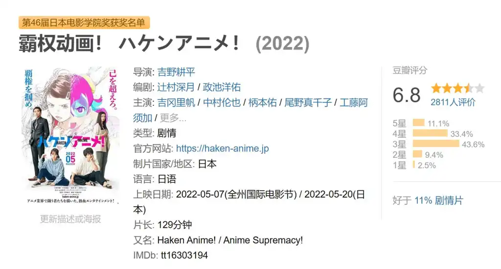 描述: 在日本动画界,同期播出的所有作品中最成功者,会得到“霸权”的称号。曾荣获直木奖的作家辻村深月以此为主题写出畅销小说《霸权动画!》后,导演吉野耕平(《星期三消失了》)就将这部热血作品搬上大银幕。连续两年蝉联日本“国民老婆榜”榜首的吉冈里帆在片中饰演初出茅庐的新人女导演斋藤瞳,而同样常年上榜、更夺得2022年“国民老公”称号的中村伦也则出演曾创作出超级热门作品的天才导演王子千晴,两人将为“霸权”的称号展开激烈竞争。除了精准生动地再现动画人的奋斗之姿、动画创作的现场与过程,本片甚至讲究到片中出现的两部动画作品均由真正的资深动画导演为其量身定做,其用心程度与水准得到各界高度赞誉,获得了日刊体育电影大奖最佳影片等不少奖项的肯定。