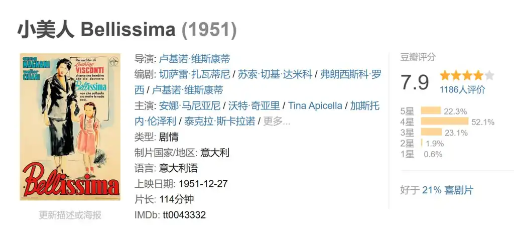 描述: 故事发生在20世纪50年代的罗马,一位非常有名的导演打算为自己的新电影招募一名小演员,玛达莱娜(安娜·玛格纳妮 Anna Magnani 饰)得知了此消息决定带自己的女儿玛利亚(Tina Apicella 饰)前去试镜。玛达莱娜一家人的经济条件非常的拮据,因此她将这次试镜视作是一次能够让全家人飞黄腾达的难能可贵的机会。