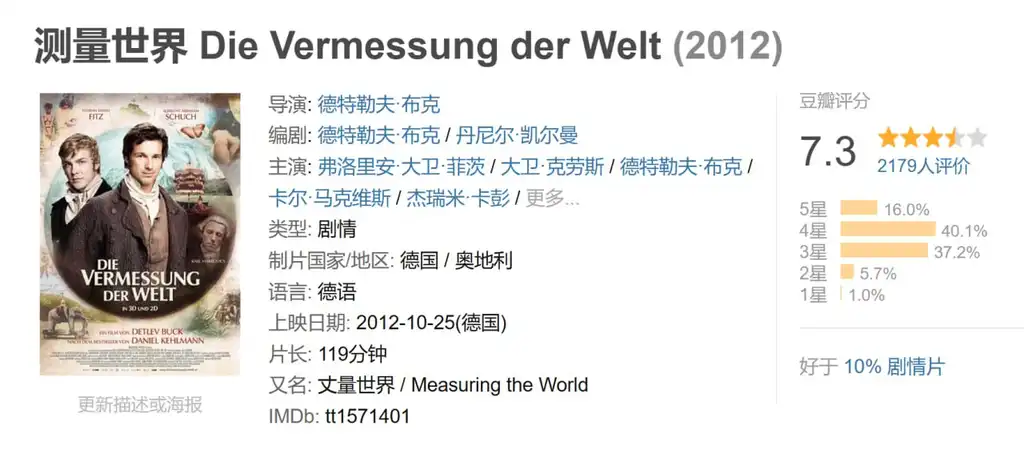 描述: 德国导演Detlev Buck也在本土筹备一部新片,把德语作家Daniel Kehlmann连续37周占据《明镜周刊》畅销书榜首的《测量世界》搬上银幕,并且使用3D技术拍摄。这两部作品论起共同点的话除了畅销之外都有着交叉的人生和激动人心的探险故事。《测量世界》主人公是18世纪末德国的两位古怪天才,分别是博物学家洪堡与数学家高斯,用着各自的方式在进行着“测量世界”,直到最后两人的生活才有了交集。写该书时的Daniel Kehlmann只有30岁。《