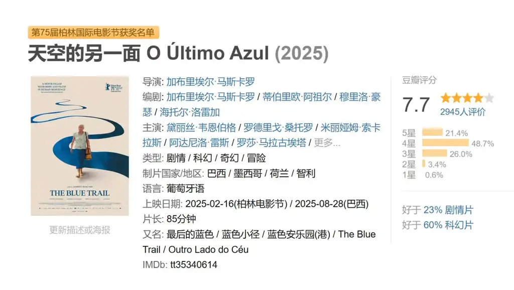描述: 巴西政府以经济复苏之名,为 80 岁以上的老年人设立了一个永久性的强制垂直隔离制度,将他们安置在一个隔离区。77 岁的特卡住在亚马逊地区的穆里蒂村,当得知年龄限制降低,自己也被包括在内时,她惊呆了。走投无路之下,特卡踏上了一段隐秘的旅程,避开官员的追捕,穿梭于河流、船只和地下世界之间,试图秘密实现自己最后的愿望——坐一次飞机。