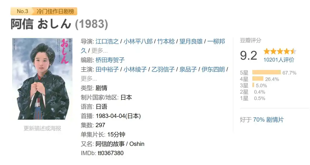 改编自桥田寿贺子同名小说,NHK电视台开播30周年纪念作品。1983年首播,继而创下62.9%的史上连续剧最高收视率纪录。随后又被翻译成二十多种语言在世界各地播放,都创下极高的收视记录。