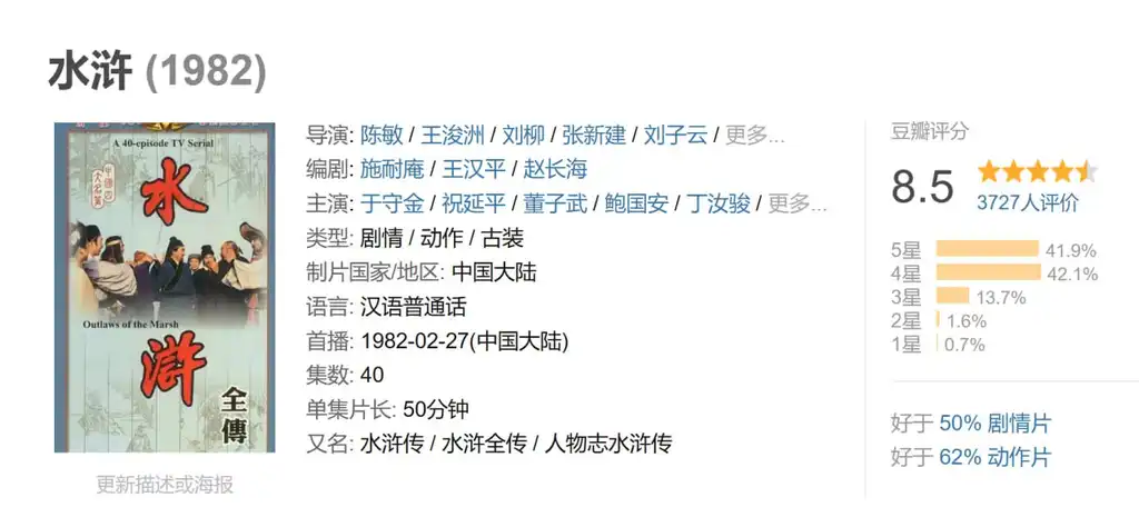 描述: 北宋末年,皇帝昏庸,奸臣当道。外虏压境,强梁四起。是非颠倒的时代,老百姓们饱受压迫,在此期间,自然有一些不甘压榨的人揭竿而起,愤而反抗。醉酒景阳冈的好汉武松打死老虎,更手刃了杀害兄长的仇人西门庆。鲁莽却仗义的提辖鲁智深打死镇关西,倒拔垂杨柳。忍辱负重的八十万禁军林冲夜奔,逼上梁山再度受辱,奋起杀死白衣秀士王伦。郓城押司黑脸宋江(鲍国安 饰)与托塔天王晁盖暗中通信,怒杀阎婆惜,以及时雨之名挂帅梁山。一百单八将相继云集水泊梁山,扬起了替天行道的大旗……